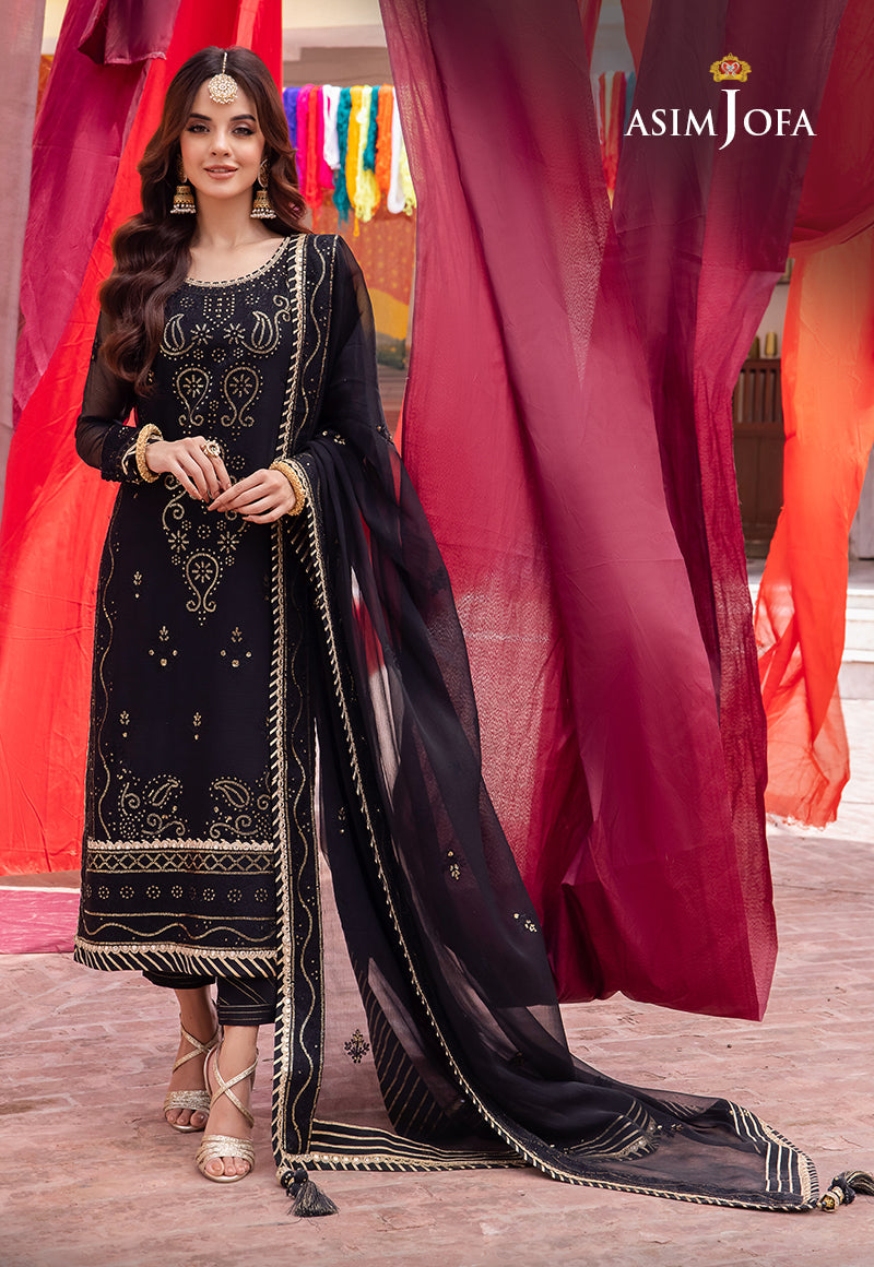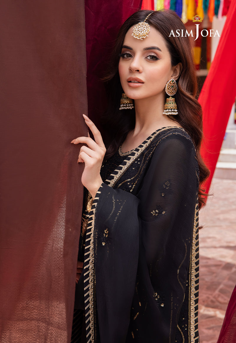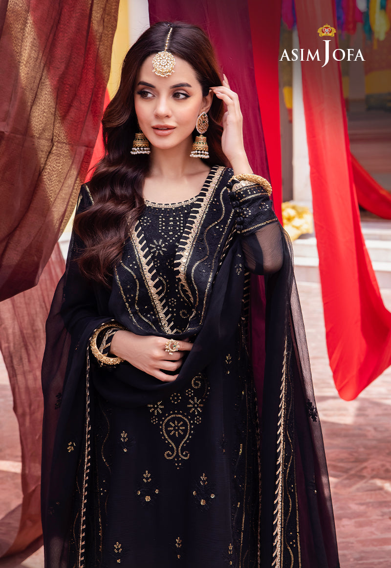 Komal Meer embodies the essence of regal minimalism in Asim Jofa's 'Abresham Collection.' The Black fabric is adorned with cupped gold sequins and intricate black threadwork, creating a captivating contrast. The ensemble exudes a sense of regality, with heavy sequins gracing the borders of both the dupatta and the shirt, featuring bold linear patterns. It's a masterful blend of understated elegance and opulence.
