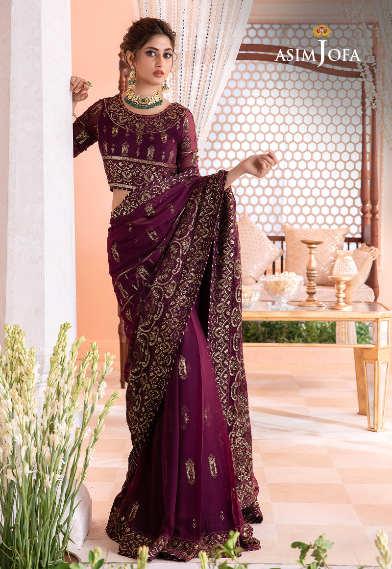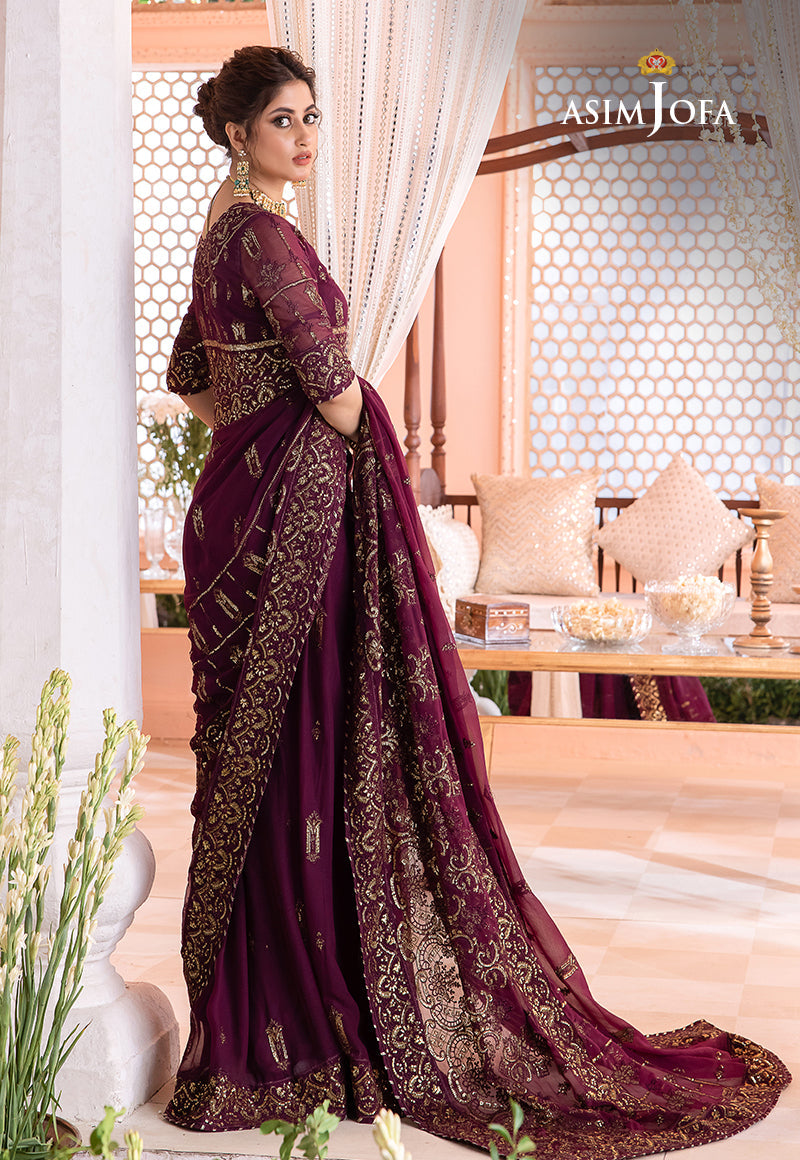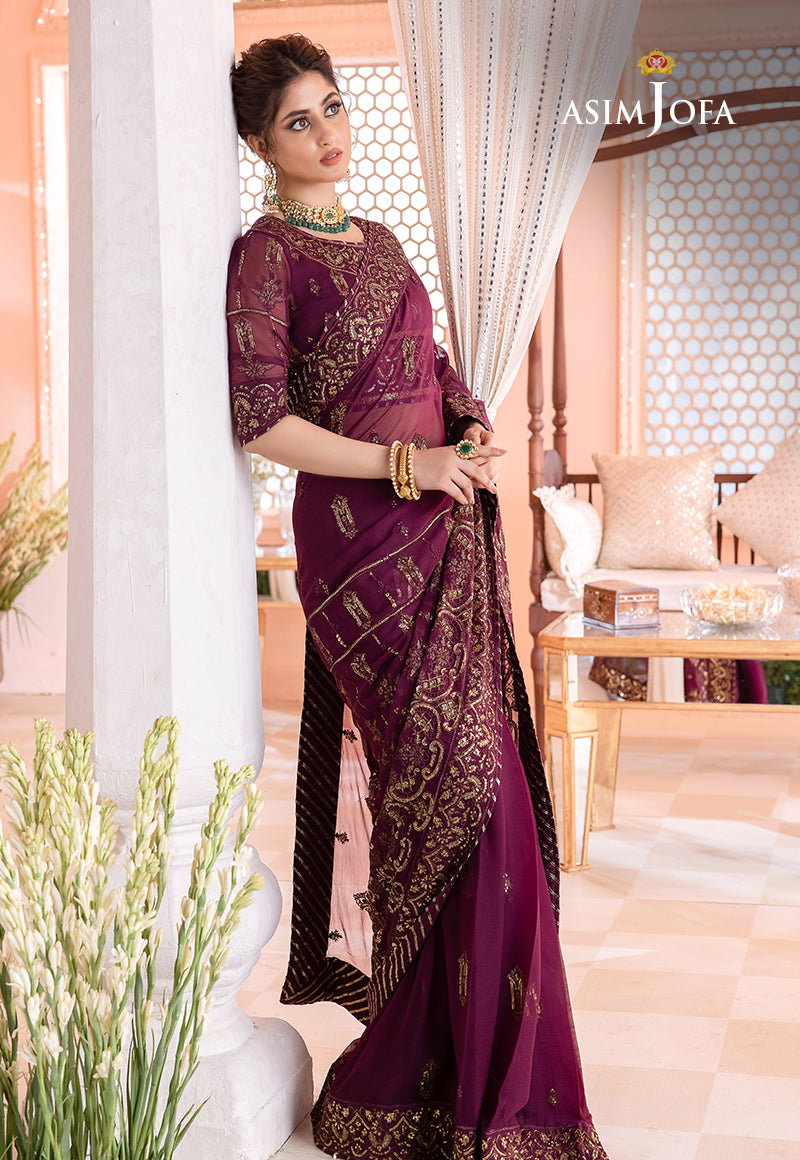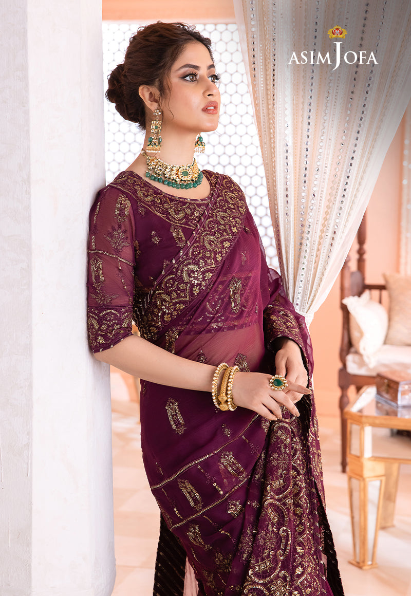 Draped in the magnificence of deep raisin hue, Sajal Aly nails this ethnic look to perfection. The diaphanous chiffon base is encrusted with expansive use of thread, antique gold zari, and dazzling cupped spangles setting the tone for this beautiful winding pattern festooned on the pallu. Heavily embroidered borders with a sprinkle of ornate motifs are running along the skirt giving this saree an opulent touch. It comes with a richly embroidered blouse further elevating this style to another level.