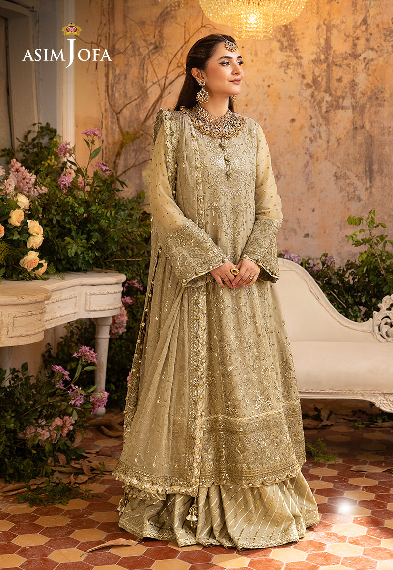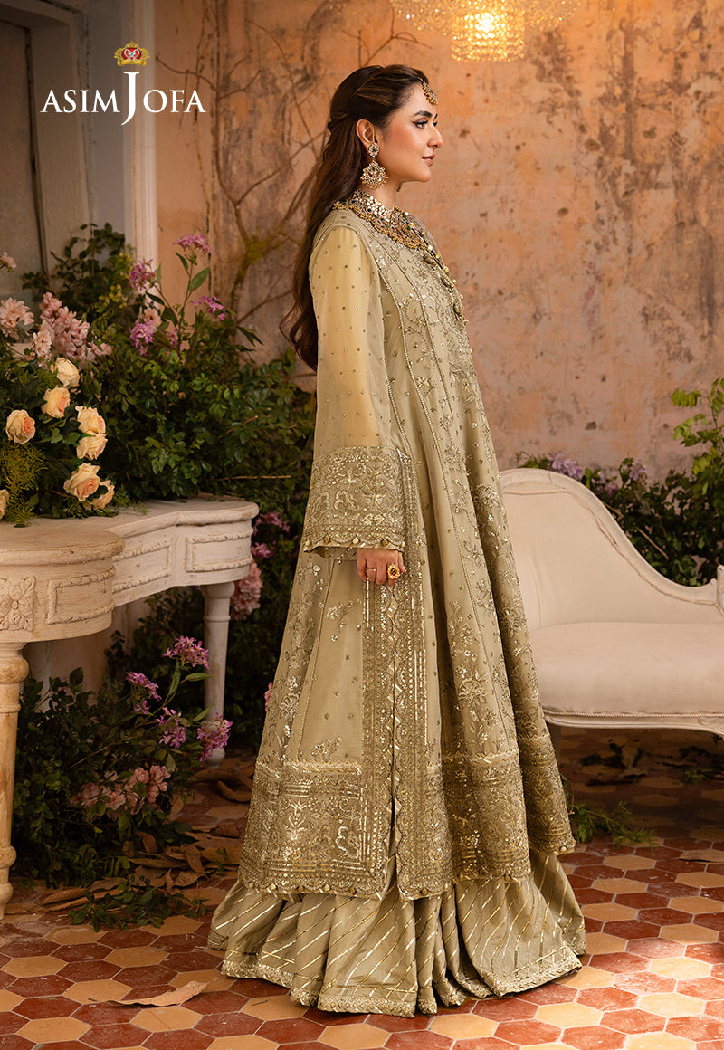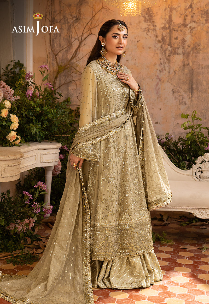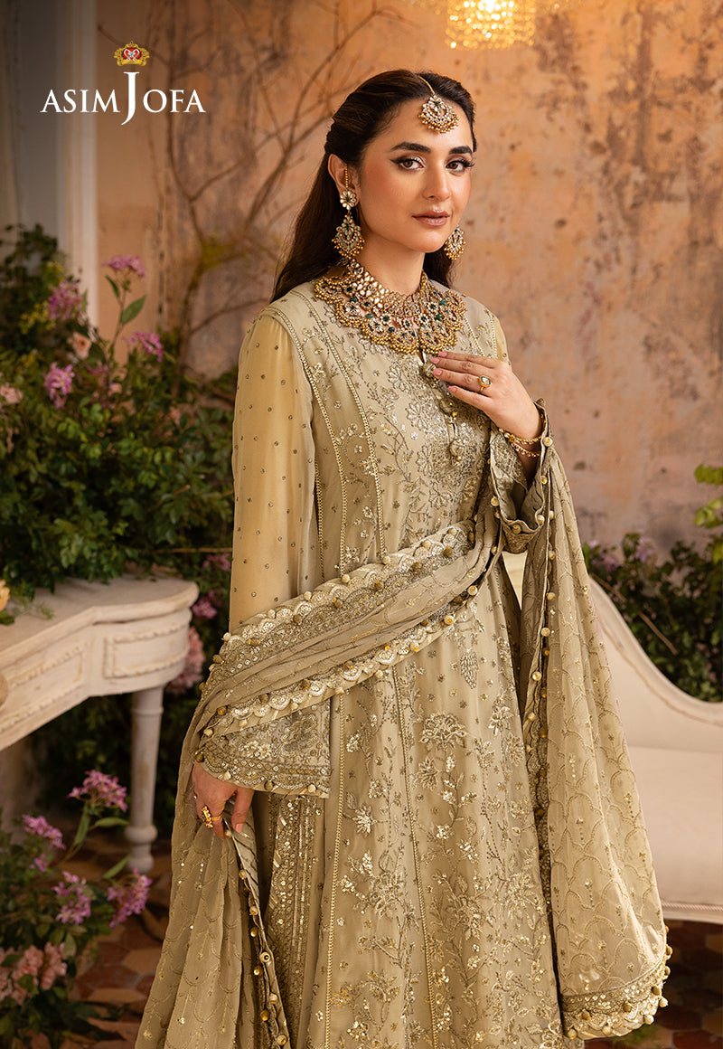 Embark on a journey of subtle opulence with our Beige ensemble from the "Khwab-E-Naubahar" collection. Adorned with a delicate interplay of 5mm and 3mm sequins and two-toned muted gold zari, this creation is a whispered melody of elegance. Intricate embroidery featuring enchanting floral motifs that reflect on the dupatta transports you to a dreamscape of timeless allure. The embroidered center panel with neckline, side kalis and sleeves, alongside borders for the hemline and chaak, narrate a tale of meticulous craftsmanship. The embroidered dupatta embraced by four-side borders completes this couture poem—a reverie in every stitch.
