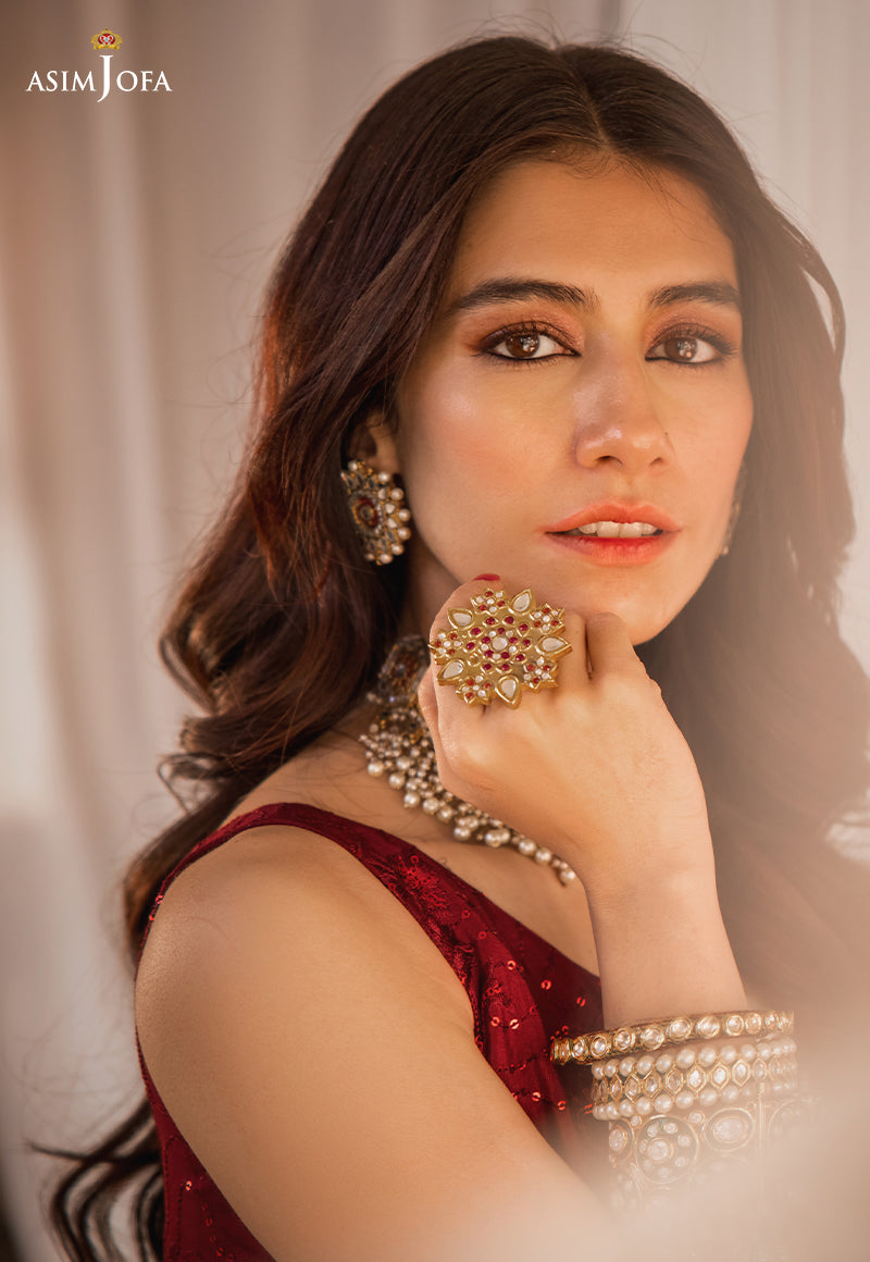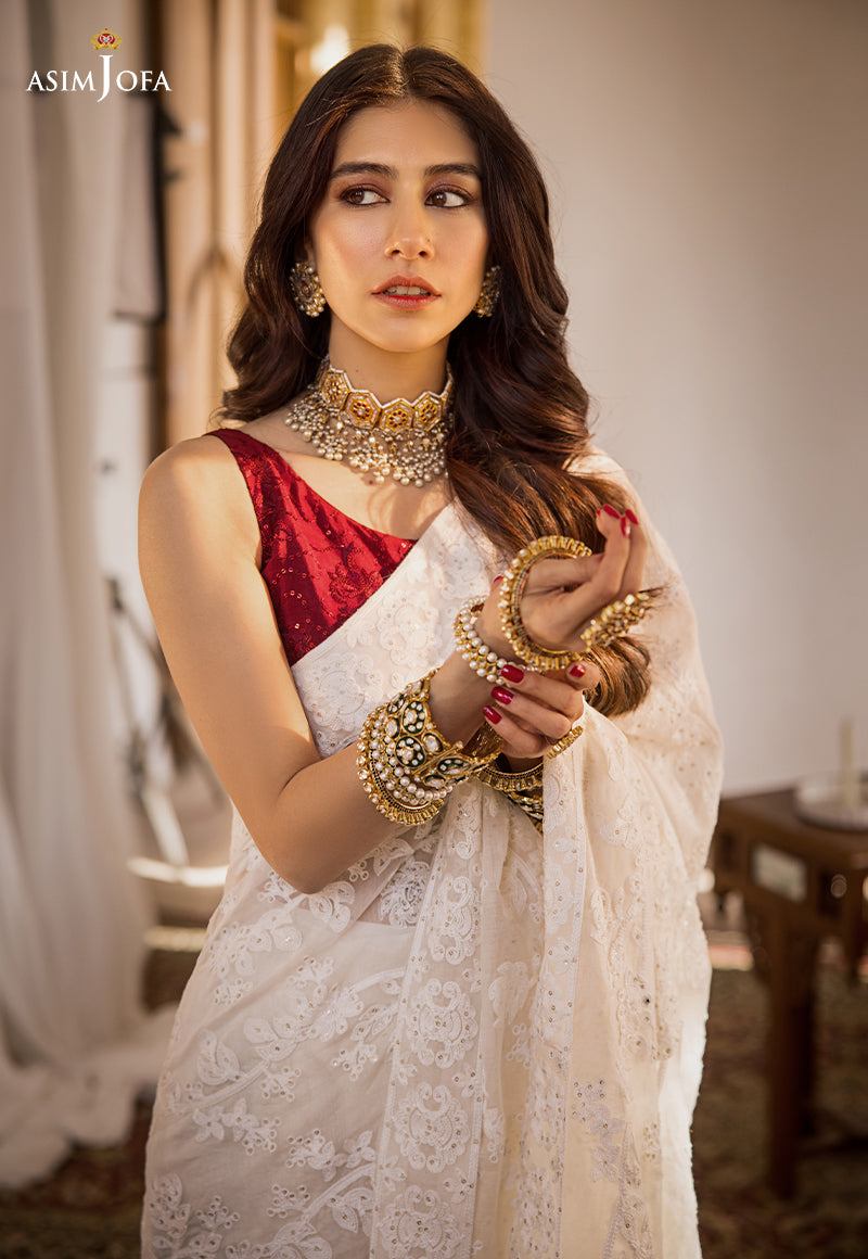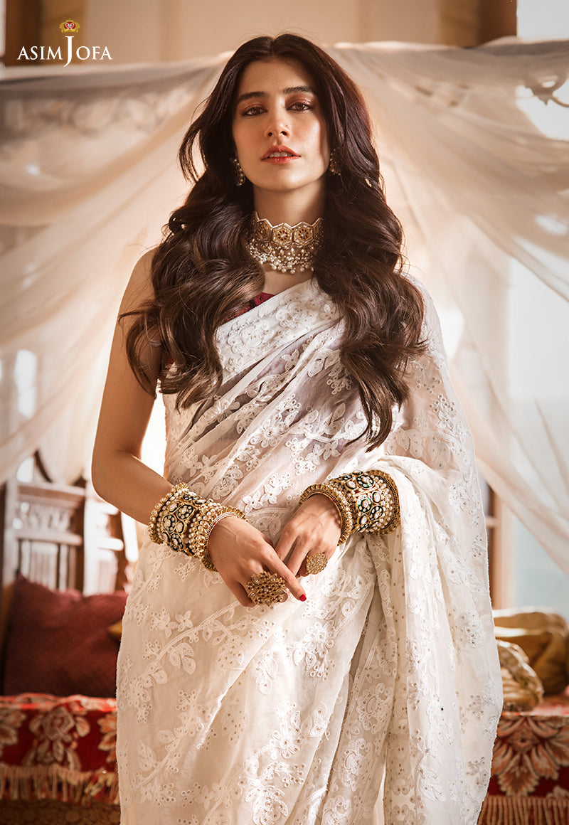 Elegantly draped in this raw Chanderi cotton Saree Syra Yousuf makes one skip a beat. The Saree is worked seamlessly along the hem worked in Chikankaari stitches decked with spangles. A pop of color is added in the form of deep maroon blouse completely embellished adding further allure to this stunning Saree.