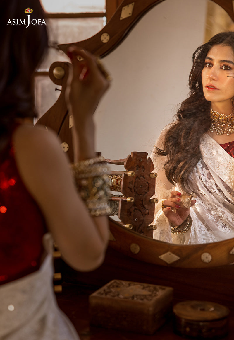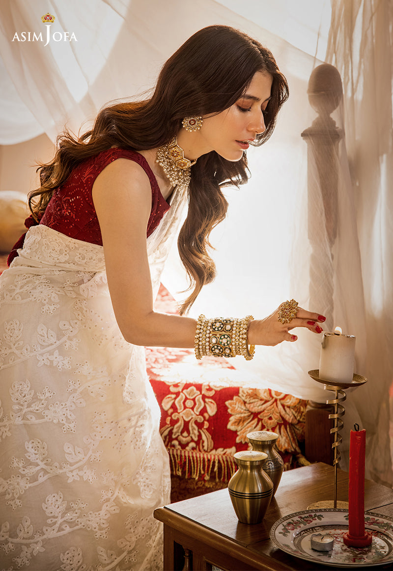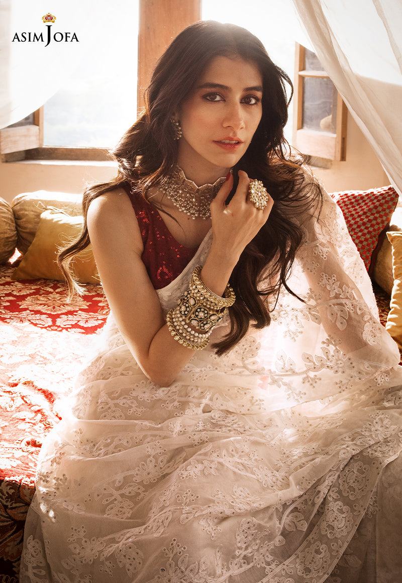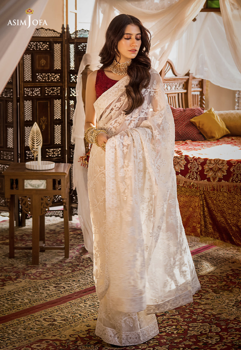 Elegantly draped in this raw Chanderi cotton Saree Syra Yousuf makes one skip a beat. The Saree is worked seamlessly along the hem worked in Chikankaari stitches decked with spangles. A pop of color is added in the form of deep maroon blouse completely embellished adding further allure to this stunning Saree.