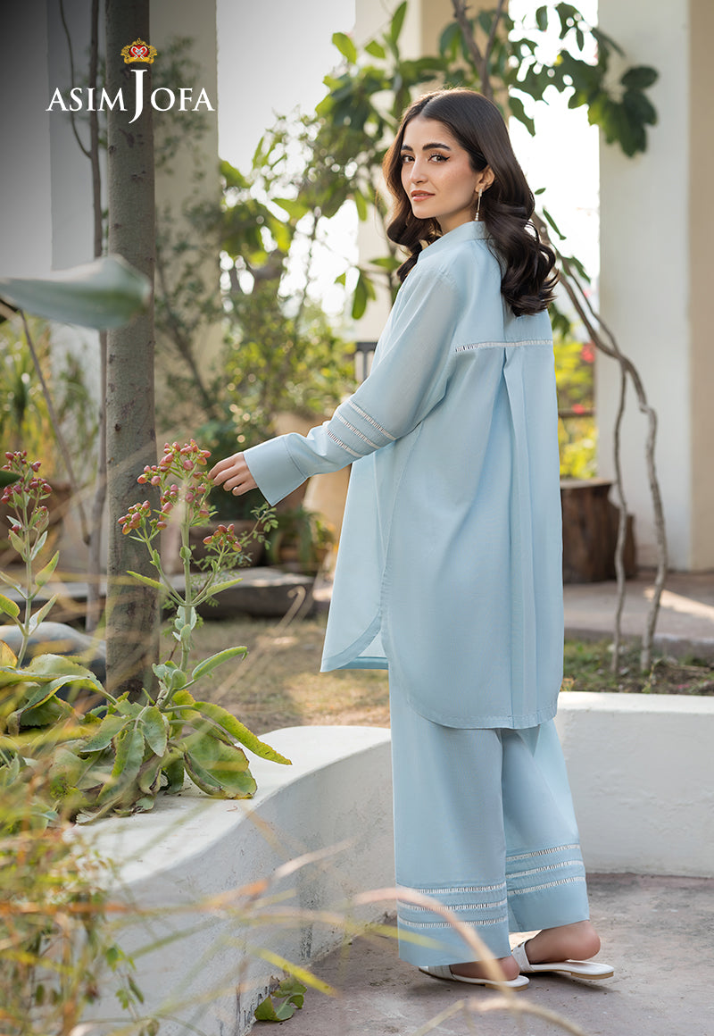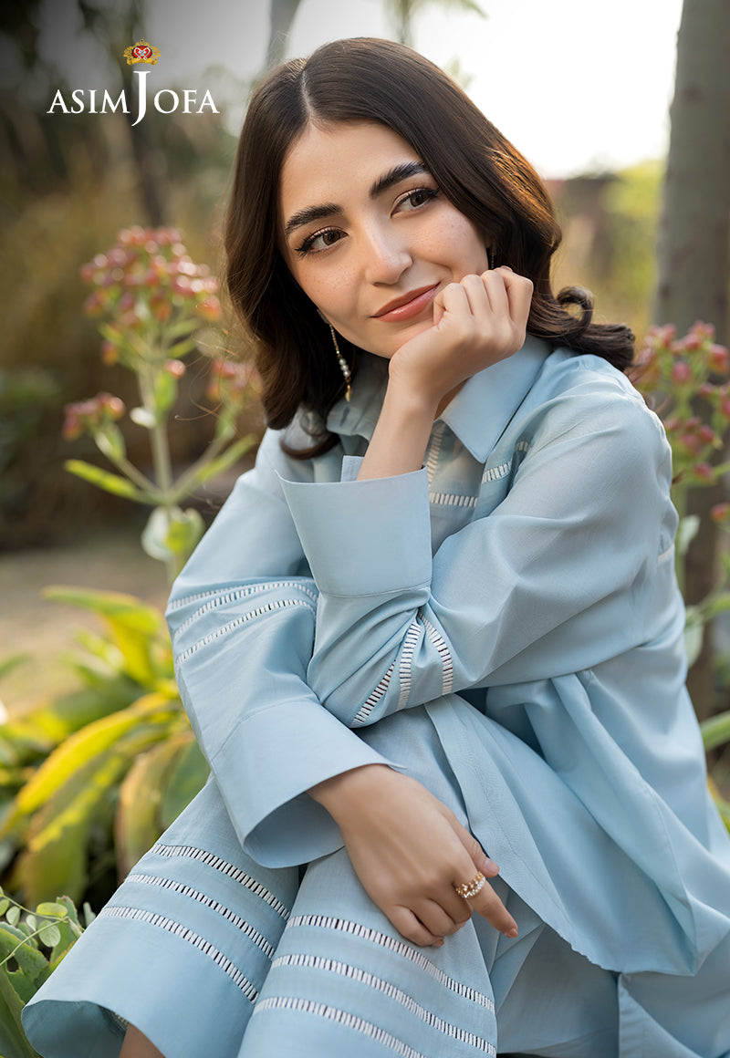 Step into sophistication with this light blue ensemble, designed to exude timeless charm. The shirt features a classic collar-style neckline and is adorned with buttons on the front, while delicate lace accents gracefully span across the design. Paired with trousers enhanced by intricate lace detailing above the hem, this outfit strikes the perfect balance between elegance and modern flair.