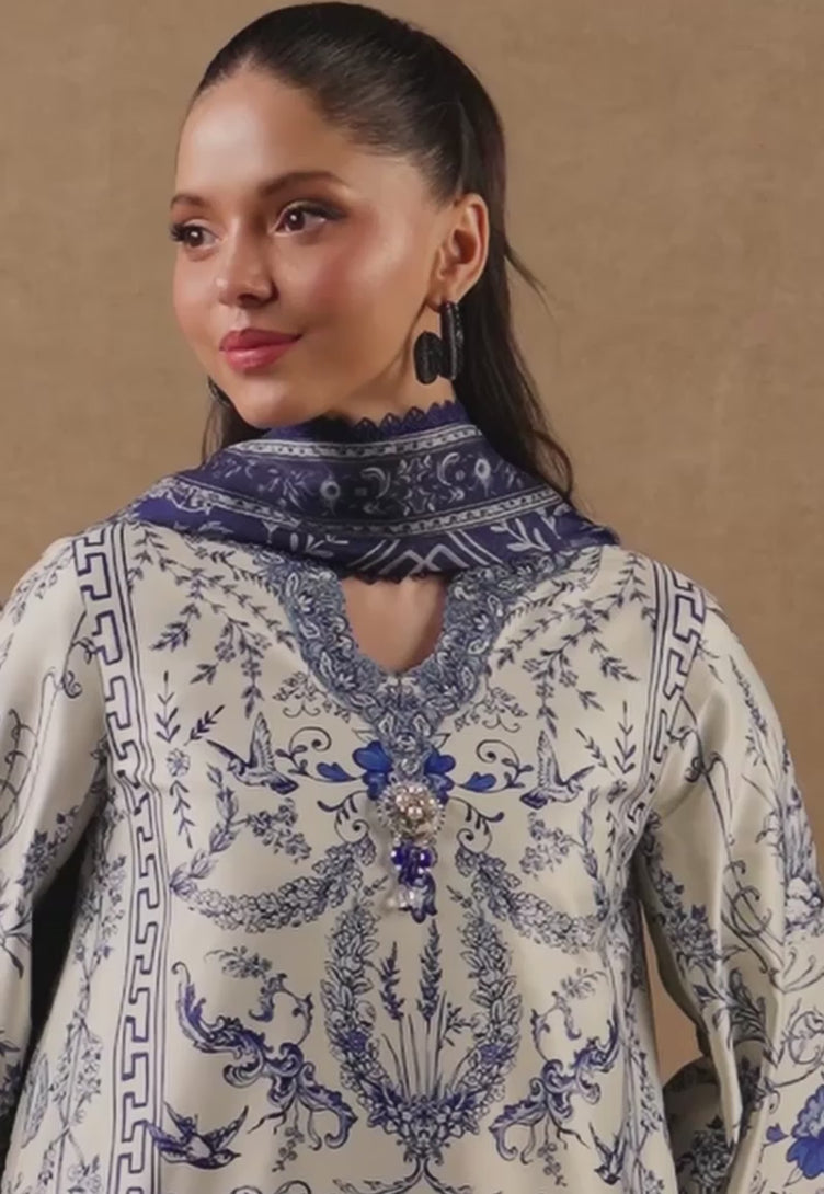 A study in contrast and charm, this cream ensemble captures the beauty of a garden in full bloom. The shirt is adorned with a lush floral print in deeper hues, where each petal and leaf appears like poetry inked on a parchment sky. Delicate sequins and fine thread embroidery enhance the neckline, sleeves, and borders. Paired with a contrasting printed silk dupatta that drapes with airy elegance, this ensemble reflects refined artistry wrapped in understated luxury.